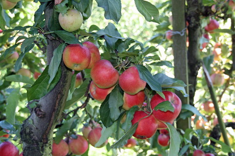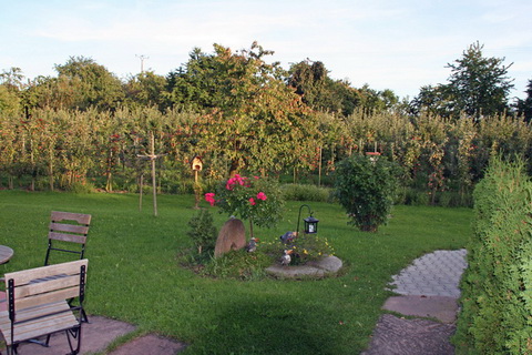 Blick aus dem Fenster auf die Apfelbaumplantage.